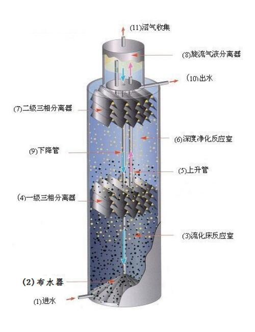 經過調節pH和溫度的生產廢水首先進入反應器底部的混合區,并與來自泥水下降管的內循環泥水混合液充分混合后進入顆粒污泥膨脹床區進行COD生化降解,此處的COD容積負荷很高,大部分進水COD在此處被降解,產生大量沼氣。沼氣由一級三相分離器收集。由于沼氣氣泡形成過程中對液體做的膨脹功產生了氣提的作用,使得沼氣、污泥和水的混合物沿沼氣提升管上升至反應器頂部的氣液分離器,沼氣在該處與泥水分離并被導出處理系統。泥水混合物則沿泥水下降管進入反應器底部的混合區,并于進水充分混合后進入污泥膨脹床區,形成所謂內循環。根據不同的進水COD負荷和反應器的不同構造,內循環流量可達進水流量的0.5-5倍。經膨脹床處理后的廢水除一部分參與內循環外,其余污水通過一級三相分離器后,進入精處理區的顆粒污泥床區進行剩余COD降解與產沼氣過程,提高和保證了出水水質。由于大部分COD已經被降解,所以精處理區的COD負荷較低,產氣量也較小。該處產生的沼氣由二級三相分離器收集,通過集氣管進入氣液分離器并被導出處理系統。經過精處理區處理后的廢水經二級三相分離器作用后,上清液經出水區排走,顆粒污泥則返回精處理區污泥床。