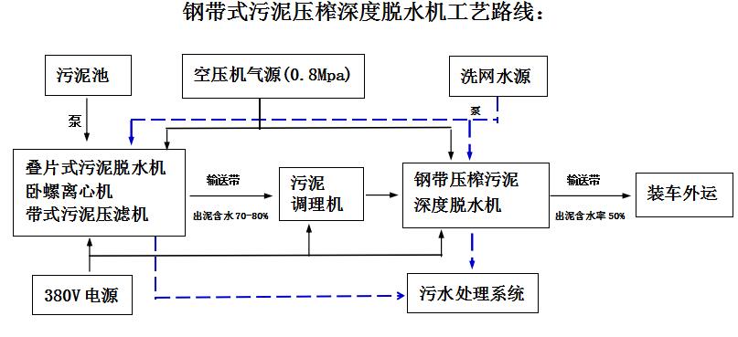 因為普通帶式壓濾機,疊片式污泥脫水機,臥螺離心機等設備的出泥含水率太高,一般在70%-85%之間,造成污泥的運輸成本、接收處置成本過高。為了降低污泥的處置成本和提高燃燒值,就必須深度脫水,包括板框壓濾機(污泥濃度40%左右),再次的深度壓榨脫水。經過雙網鋼帶壓濾機后的污泥濃度可以達到40%-52%之間,具體情況視污泥種類而定。明顯降低運輸及處置成本。